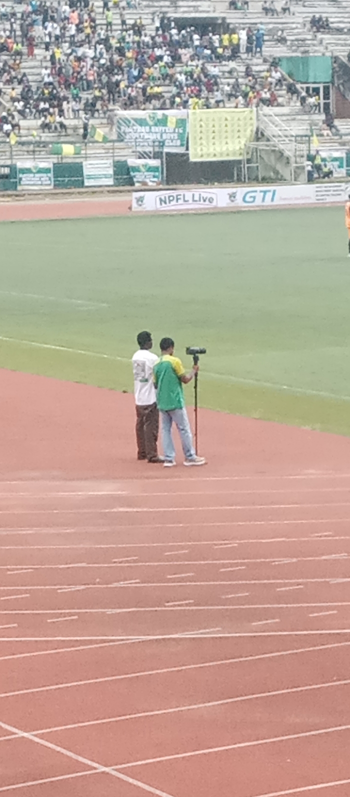 This image depicts a sporting event within a new stadium facility in Jos, Plateau State, Nigeria, consistent with the prominent "PLATEAU UNITED FC" banner. In the foreground, a red running track with white lane markings extends across the lower portion of the frame. Two adult males stand on the track adjacent to the green grass football pitch. The man on the left wears a white t-shirt and dark trousers. The man on the right, clad in a green and yellow short-sleeved top and light blue jeans, operates a black camera mounted on a monopod or slender tripod, directed towards the field of play. The midground consists of the well-maintained green football pitch. The background features stadium stands, partially filled with numerous spectators. Along the perimeter of the pitch, advertising hoardings display "NPFL Live" and "GTI" logos. Additionally, a large white banner with "PLATEAU UNITED FC" and "FOOTBALL BOYS CLUB" text is clearly visible, alongside a partially obscured green and yellow banner. A person in an orange jersey is partially visible on the far right of the football pitch. The scene portrays an active outdoor sporting event being filmed or broadcast.