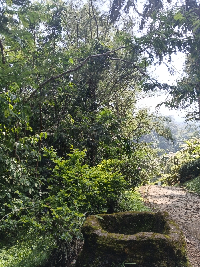 A stone trough covered in moss sits in the foreground, nestled amongst lush green foliage. Beyond it, a cobbled path winds into the distance, flanked by trees and ferns. The scene evokes a sense of tranquility and suggests a garden or park setting. Hints of sunlight filter through the canopy, creating a dappled effect on the path.