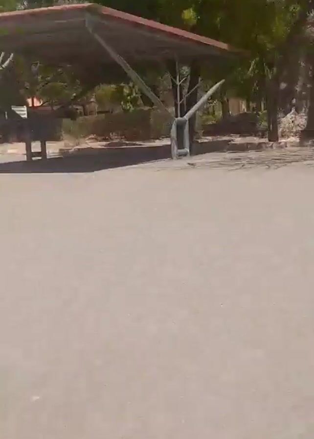 n empty paved area, possibly a parking lot, on a sunny day. In the background there is a metal shade structure with a red roof, several trees with green leaves, and a building with a red roof. A bench is visible near one of the trees. There does not appear to be anyone in the frame.