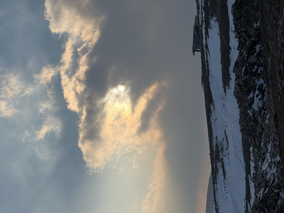 The image displays a barren, rocky landscape in Talfita, Syria, under a dramatic, partially clouded sky. The sun, a bright disc, is visible through a dense formation of yellowish-orange and grey clouds, illuminating them from behind. The upper left portion of the sky is clearer, showing a pale blue hue. The foreground and mid-ground consist of dark, rugged earth and numerous grey rock fragments, with irregular patches of white snow distributed across the undulating terrain. On a distant rise to the right, a solitary, low-profile, dark-colored structure, appearing to be constructed from robust materials, stands. It features a flat or slightly sloped roof. No individuals, animals, or discernible actions are present. The lighting conditions suggest either early morning or late afternoon.
