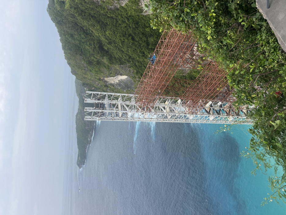 The image displays a panoramic view of a coastal cliff area in the city of Sakti, Indonesia, under an overcast sky. In the foreground and midground, a significant construction or maintenance operation is underway. A tall, white, open-lattice tower extends vertically downwards from the cliff edge, partially over the deep blue ocean water. Adjacent to this, a large, reddish-brown rectangular metal framework, composed of interconnected beams, protrudes horizontally over the cliff face, appearing to be under construction or maintenance. Three individuals are visible on these structures. Two individuals are present on the reddish-brown framework; one is seated within a blue aerial work platform, while the other is standing nearby. A third individual, a small dark figure, is discernable on the white tower. The environment consists of steep, vegetation-covered cliffs descending abruptly into the ocean. The ocean waters exhibit a gradient from dark blue in deeper areas to lighter turquoise closer to the cliff base, with visible white surf from breaking waves. Dense green foliage covers the immediate foreground and the cliff face. A rugged, vegetated coastline extends into the hazy distance on the left horizon.