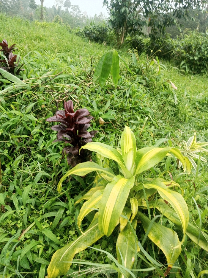 This image displays a densely vegetated outdoor scene in Irupalai, Sri Lanka. The foreground features thick green ground cover. Prominently positioned on the right is a plant with broad, lanceolate, variegated leaves, predominantly light green with distinct yellow longitudinal stripes. To its left, a smaller plant exhibits dark burgundy, almost black, elongated leaves arranged compactly. The midground consists of various green grasses and unidentifiable broad green leaves. The background is a dense, verdant natural landscape comprising numerous trees and shrubs under a hazy or overcast sky. No individuals, animals, or man-made objects are present. The scene is static.