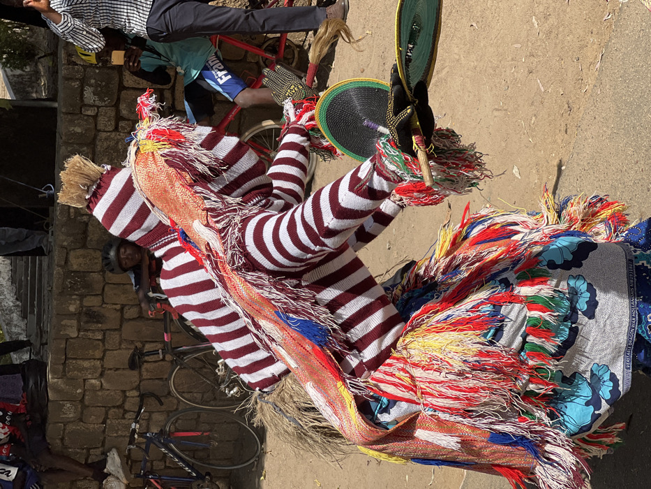 The image depicts an outdoor cultural event in Jos, Nigeria. A central figure, likely a performer or masquerader, occupies the foreground, attired in a multi-component costume. The upper body is covered by a red and white horizontally striped knitted garment, topped with a straw-like element. A fringed, woven shawl in red, white, blue, and yellow is draped over the shoulders. The lower section of the costume features dense, colorful fringes (red, yellow, blue, green) layered over a patterned fabric displaying blue floral motifs and the text "VERITABLE DRAGON WAX HOLLANDAIS 6161931802". The figure's right hand, gloved in black with yellow polka dots, holds a wooden stick that connects two disc-shaped, woven objects, one black and one green. The figure is captured in a dynamic, forward-leaning stance. In the mid-ground, a stone wall constructed from rough-hewn blocks serves as a backdrop, with a set of steps visible behind it. Several individuals are present, observing the event. To the left, two bicycles, a blue road bike and a darker-framed bicycle, are parked. A person wearing a dark helmet is partially visible behind these bicycles. To the right, a person in a white and dark striped shirt and dark trousers stands. Adjacent, another individual is seated on a red bicycle, wearing a light blue top and dark blue shorts with "Franci" printed on them, holding a smartphone to record or photograph the scene. A person with a yellow helmet is partially visible behind the seated individual. The ground is unpaved, consisting of dry, light-brown earth, illuminated by direct sunlight, casting distinct shadows.