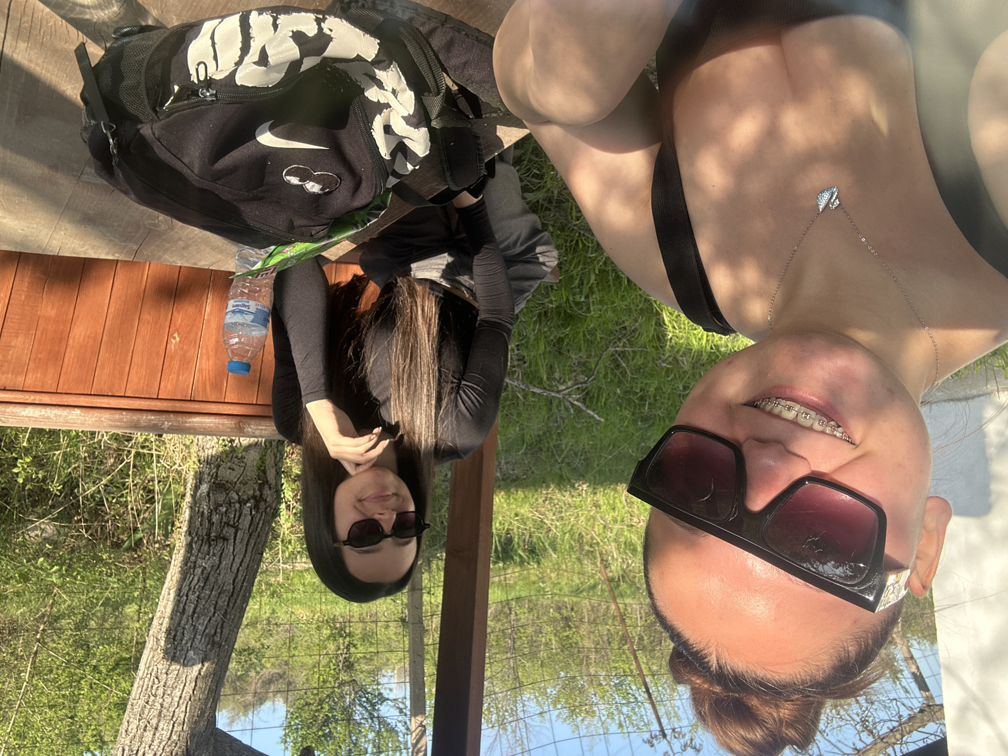 Two females are positioned outdoors near a wooden structure in Izvor, Bulgaria. One is wearing a black long-sleeved shirt and sunglasses, sitting next to a black Nike backpack and a water bottle. The other is wearing a black top, sunglasses, and a necklace, looking directly at the camera. Green vegetation is visible in the background.