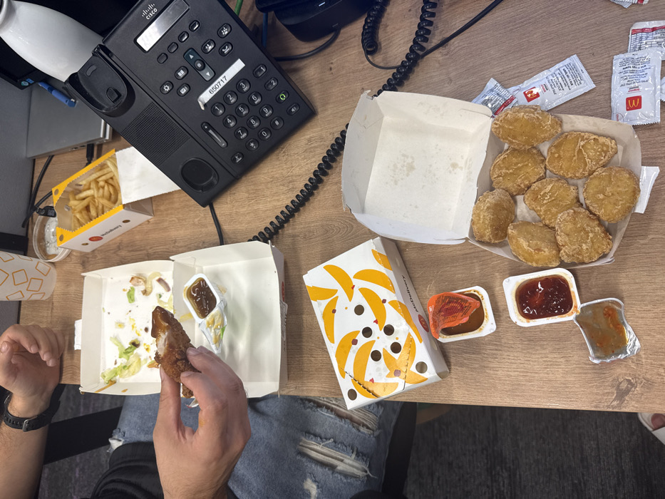 The image depicts a light-colored wooden desk surface cluttered with fast-food items and office equipment, consistent with an office or workspace in Rishon LeZion, Israel