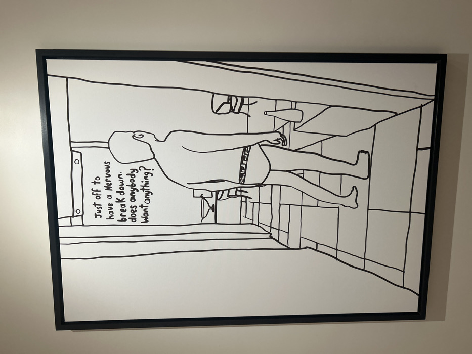 A framed artwork hangs on a wall. The artwork depicts a person in underwear walking away, seemingly into a room with tile floors. A bottle and chair are visible in the background. Text next to the person reads, "Just off to have a Nervous breakdown. does anybody want anything?" The drawing is minimalistic, done with thick black lines on a white background.