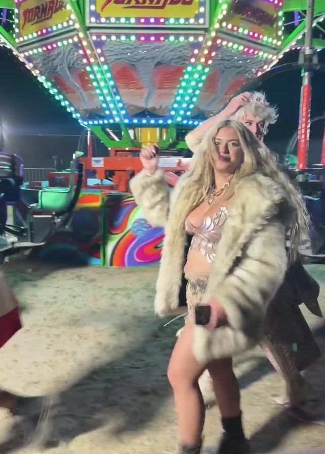 At an outdoor night carnival, two women are walking near a ride labeled "Tornado" with lights. The woman in front is wearing a faux fur coat over a sparkly top and lace skirt. She stops, smiles, and waves to the camera. The other woman wears a crown. A person walking behind the two women carries a red and white tote bag. The camera blurs.