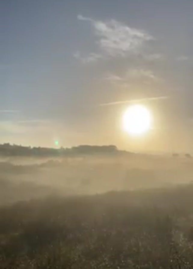 The video captures a serene, sunlit landscape shrouded in a blanket of fog
