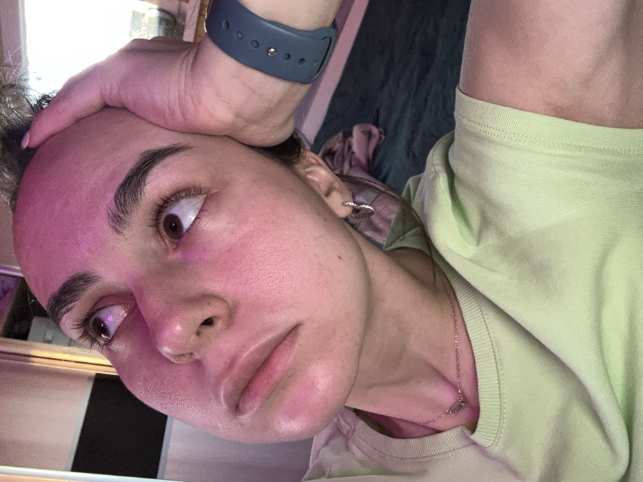 An indoor scene in посёлок опытного хозяйства «Ермолино», Russia, features a female individual depicted from a low-angle perspective. The subject has medium-toned skin, dark eyebrows, and dark eyes, looking upwards and slightly to the right with a pensive expression. Her face is illuminated by a prominent pink-purple light source from the front-left, casting a glow across her forehead, cheeks, and nose. Her dark hair is pulled back. She wears a light green crew-neck short-sleeved top, a thin silver-colored necklace with a small rectangular pendant, and a small, silver-colored hoop earring in her visible right ear. Her left hand is raised, with the palm resting against her forehead, and a dark blue or grey digital smartwatch is worn on her left wrist. The background is softly blurred, showing a light-colored vertical surface to the left, and a darker area, possibly a bed with a dark green blanket, to the right. A brighter white light source is visible in the upper right background.