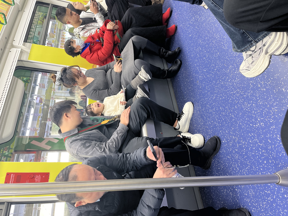 Inside a public transit vehicle, passengers sit closely on a shared bench. A young child, perched on an adult’s lap, is laughing with their mouth open. The people are dressed in casual clothes. Several passengers are occupied with their mobile phones. A person is holding glasses and what looks like a pen. The floor is blue with small white dots. The atmosphere suggests a typical commute in an urban setting.