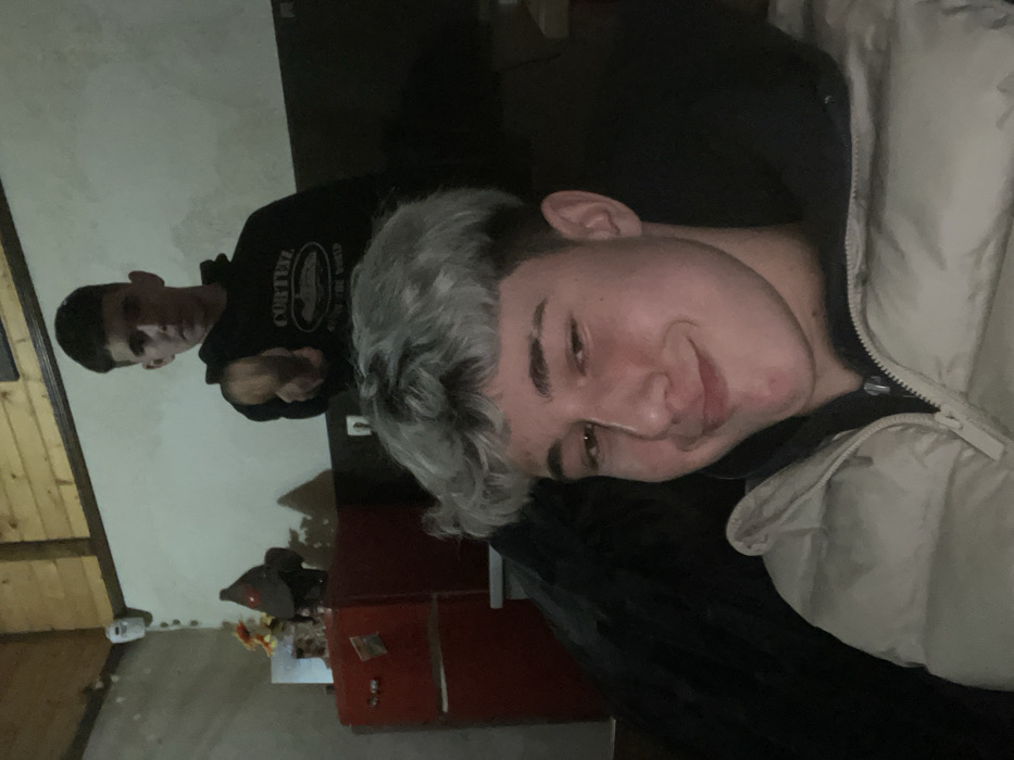 An indoor photograph depicts two young males within a residential setting in Botevgrad, Bulgaria. In the foreground, a male with light grey, short hair styled with a fringe smiles directly at the camera. He wears a light-colored, possibly beige, puffer jacket over a dark, zippered garment. Behind him and slightly elevated, a second male with dark, short hair is visible, less in focus. He wears a black hooded sweatshirt featuring "CORTEZ" on the chest. This individual extends his right arm forward, pointing a hand with curled fingers towards the camera or the foreground subject. The background consists of a light-colored wall with a horizontal wooden trim along its top edge. To the left, a small, red, retro-style refrigerator is partially visible, adorned with small magnets or papers. On top of the refrigerator, a floral arrangement in a pot and a dark, conical decorative object are present. A white device, possibly a security camera, is mounted on the upper left wall. Dark, undefined objects occupy the lower left background. The scene is illuminated by artificial light, casting the foreground subject in brighter light than the background.