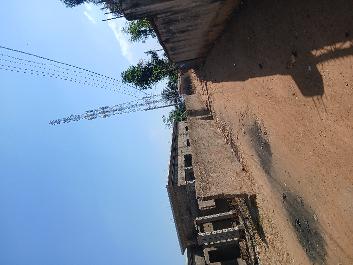 The image portrays an unpaved reddish-brown dirt road in Akwanga, Nigeria, under a clear blue sky. The road surface contains scattered debris and dark, irregular stains. To the left, a partially constructed, multi-story concrete block building with an unfinished roof and exposed rectangular openings for windows and doors is visible. Decorative concrete pillars are integrated into the structure's facade. A lower, unfinished concrete block wall runs parallel to the road on the left. To the right, a taller, weathered concrete block wall extends along the road, casting a long, dark shadow across a significant portion of the dirt path. In the background, a tall metal lattice telecommunications tower rises against the bright sky. Multiple overhead electrical or communication cables are visible diagonally traversing the upper right section of the frame. Green foliage is present behind the right wall and near the base of the tower. No human subjects or discernible activities are depicted.