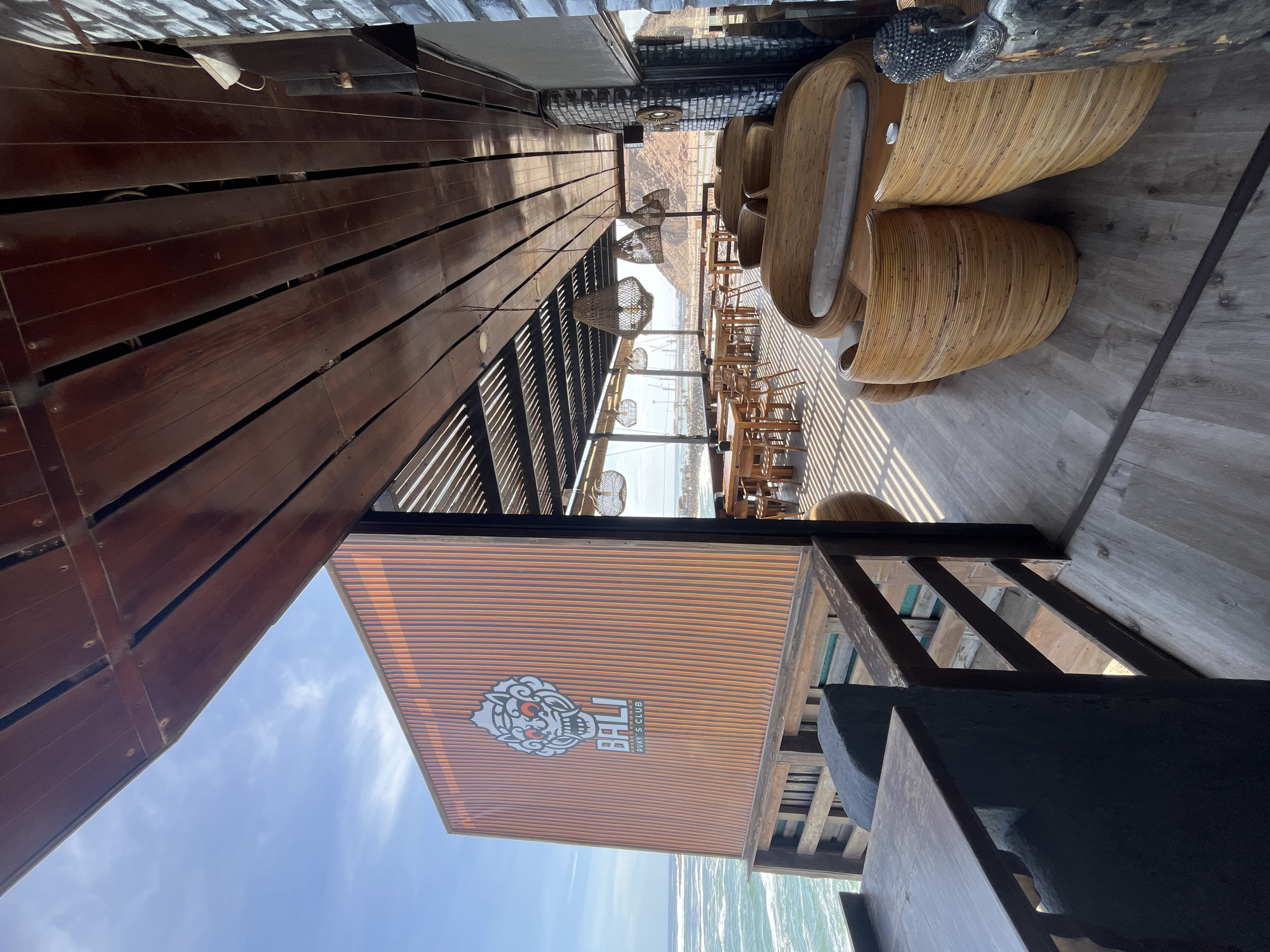 This image depicts an outdoor, semi-covered establishment identified as "BALI RUKY'S CLUB" in Arica, Chile, situated directly over the ocean. The scene is devoid of people. The foreground shows a dark wooden table edge and a dark structure, possibly part of a booth or counter, with dark wooden railings separating the space from the sea. The floor is covered with light wood-patterned planking. The establishment features two main seating areas. To the right, a lounge area contains multiple curved sofas made of woven light-brown rattan with light-colored cushions, accompanied by matching cylindrical stools and small wooden side tables. A decorative dark wooden Buddha head statue is positioned near this lounge furniture. To the left and extending into the mid-ground, a dining area consists of numerous rectangular wooden tables paired with matching wooden chairs. Overhead, a dark brown slatted wooden ceiling extends across the space, with several woven rattan pendant lights suspended from it. The exterior wall facing the ocean features a large sign with a stylized white demon or mask logo with red eyes, above the text "BALI RUKY'S CLUB," all set against an orange, vertically ribbed paneling. Beyond the railings and the club structure, the turquoise ocean is visible with white breaking waves. In the distance to the right of the open-air dining section, a port with visible industrial cranes and structures is present. Further in the background, under a mostly clear blue sky with sparse clouds, reddish-brown mountains rise.