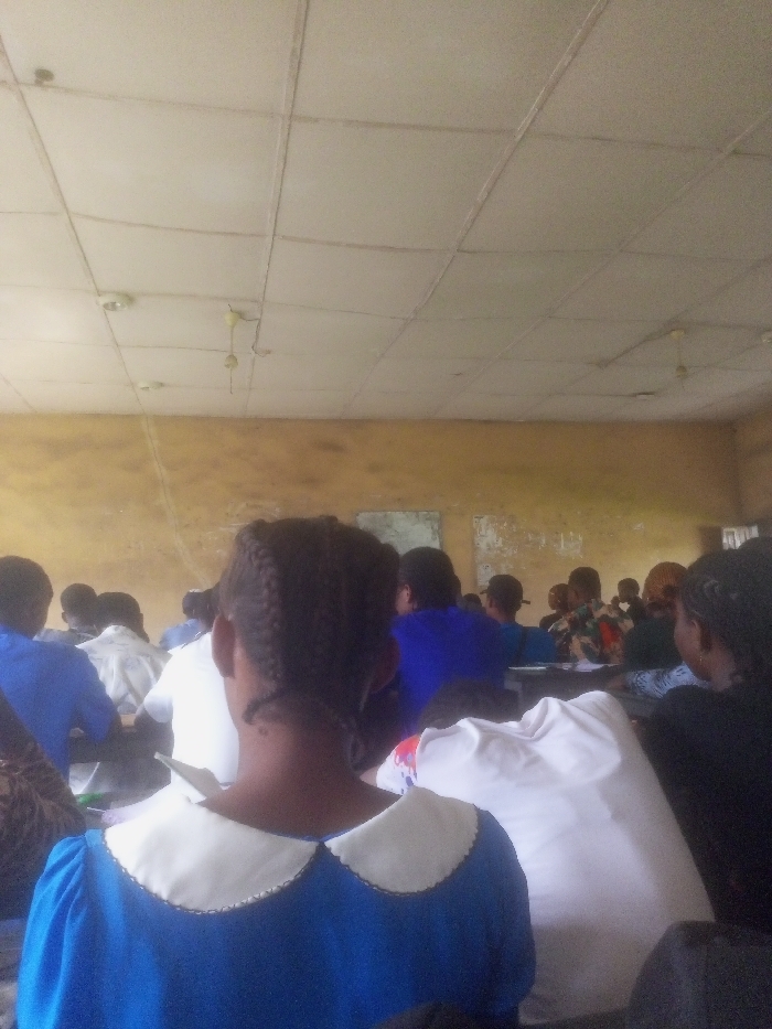 The image, captured in Uyo, Nigeria, depicts an indoor educational setting, likely a classroom or lecture hall, viewed from the rear