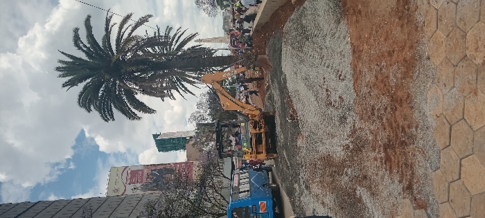 This image captures a daytime urban street scene in Nairobi, Kenya, specifically within the Uhuru Highway area, with the Uhuru Monument discernible in the background. In the immediate foreground, a paved sidewalk with light brown hexagonal pavers transitions into an unpaved area of reddish-brown earth mixed with light grey gravel/ballast, forming several small mounds. A yellow backhoe loader, branded 'JCB', is centrally positioned on this unpaved material, with its front bucket arm extended towards the base of a large palm tree located on the right. To the left of the backhoe, a blue Nissan Caravan-type public service vehicle (matatu) with white detailing is on a paved road, appearing to be stopped or in slow traffic. Several individuals are standing or moving near this vehicle and the construction zone. Behind the construction area, on the right side of the image, a concrete barrier separates the work site from a pedestrian pathway where numerous people are walking. Further back, a tall, white, pointed obelisk, identified as the Uhuru Monument, rises above the structures and foliage. The background on the left features multiple tall city buildings. One prominent building displays large commercial billboards, one depicting multiple figures. Another building appears partially green. The sky is partly cloudy with patches of blue. Jacaranda trees with purple blossoms are visible in the mid-distance. The scene indicates ongoing urban development or roadworks.