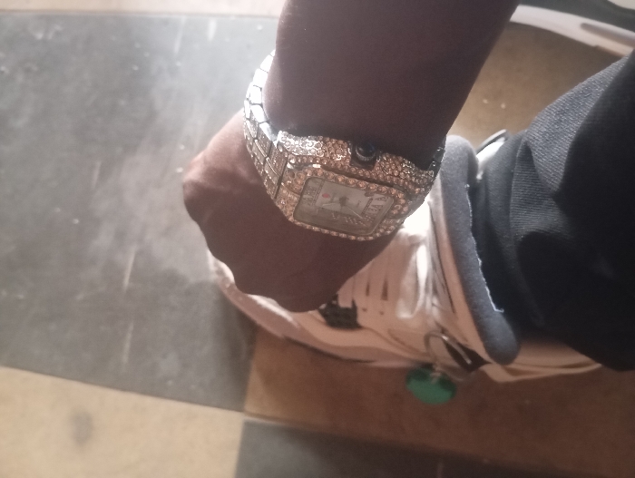 The image displays a close-up, top-down perspective of a person's right arm and leg in what appears to be an indoor environment. The individual has a dark skin tone. A prominent, rectangular, silver-toned wristwatch, heavily encrusted with numerous clear, reflective stones, is worn on the right wrist. The watch face is light-colored with dark markings and hands. The right leg is partially visible, clothed in black fabric, leading to a white athletic shoe worn on the foot. The shoe features dark-colored trim around the ankle opening and white laces. A small, circular, green object rests on the floor near the front of the shoe. The flooring consists of two distinct sections: a dark gray surface with lighter scuff marks on the left, and a lighter brown or tan surface beneath the shoe and to the right. The specific location within the city of Unknown, Unknown is not ascertainable from the provided visual information.