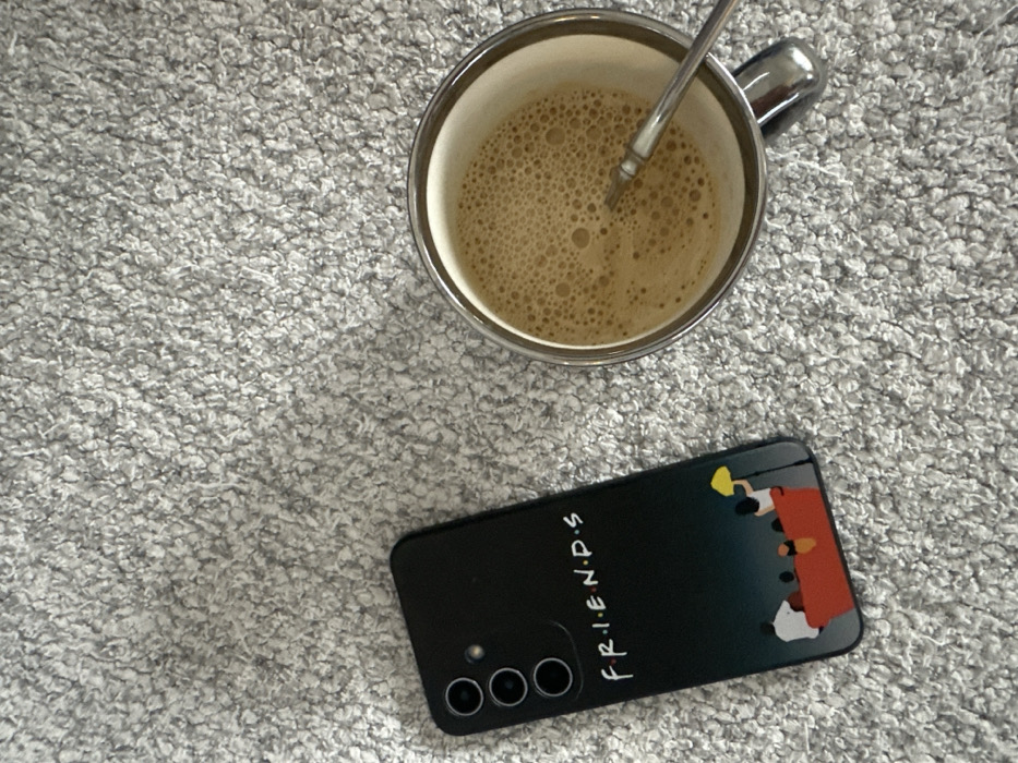 A grey textured surface showcases a coffee mug with a metallic handle and a spoon stirring the contents. The beverage is light brown with foam bubbles. Below, a black smartphone with three camera lenses has a "Friends" themed case, depicting the iconic sitcom characters on the orange couch. The scene evokes a cozy, relaxed atmosphere.