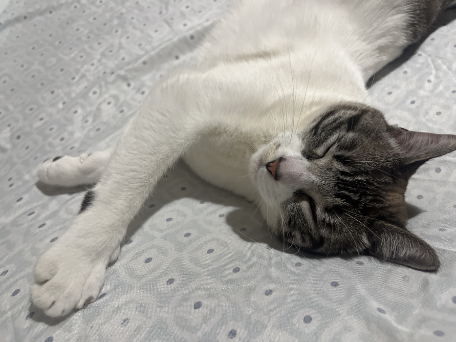 - "A domestic feline, identified as a cat, is depicted resting supine on a light-colored patterned textile surface, in a location specified as Málaga, Spain" by FM-O7LmK2, licensed under CC BY 4.0
