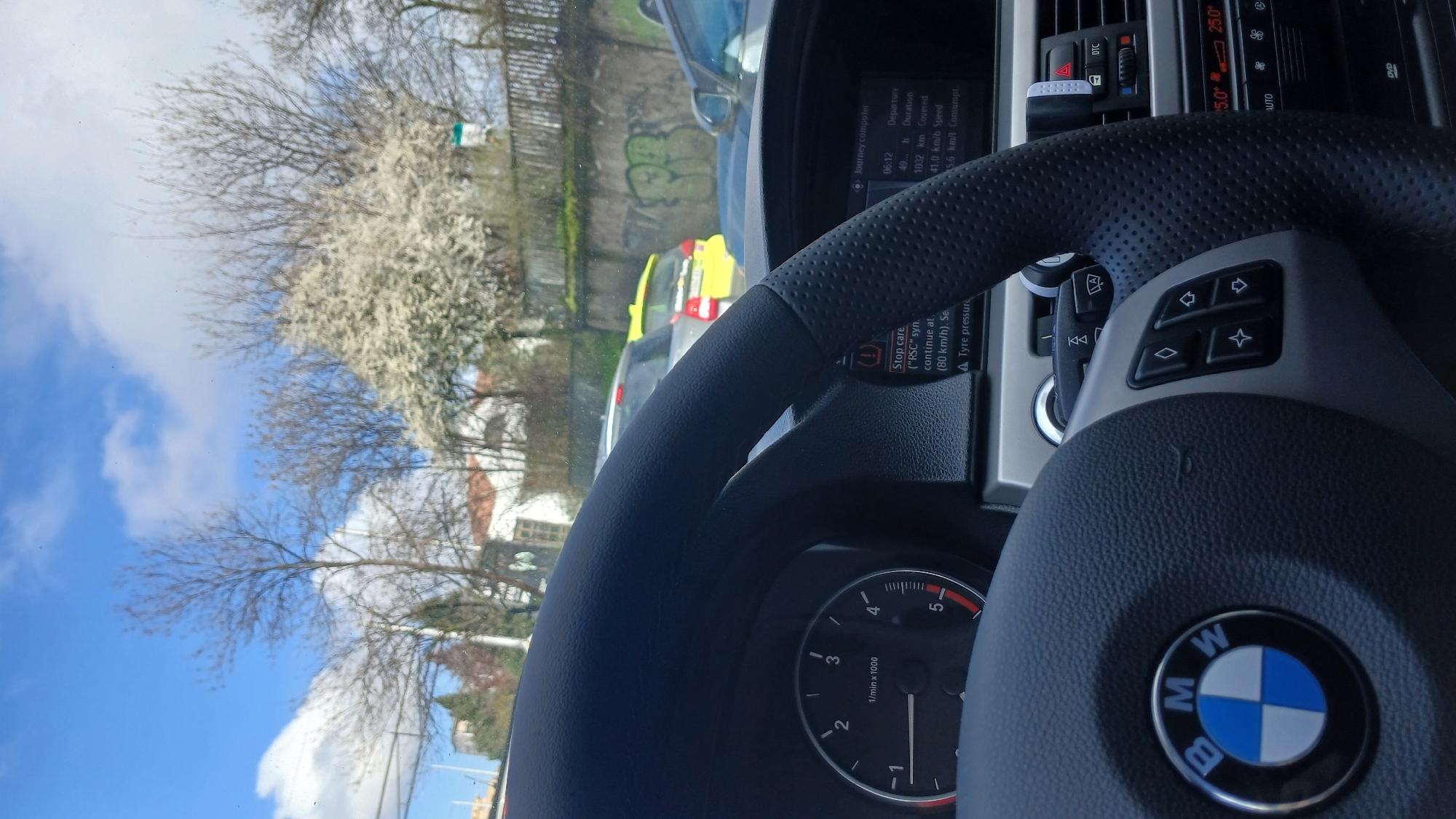 The image depicts an urban street scene in Sofia, Bulgaria, viewed from the interior of a stationary BMW vehicle