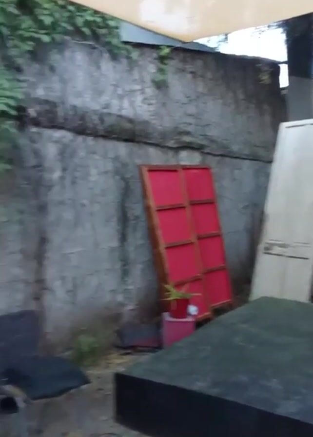 n outdoor stage area set up with various props including doors, plants, and a microphone stand. There's a small stage platform, and a chalkboard sign with text written on it in a light-colored chalk. The environment appears to be a backyard or garden area, with a stone wall covered in green vines visible in the background. A partial canopy is visible overhead. The sign displays the text "ITROFIL MONGEN, KUME MONGEN, YAMUWUN NOR CHE". The video pans slightly to show the sign more clearly.