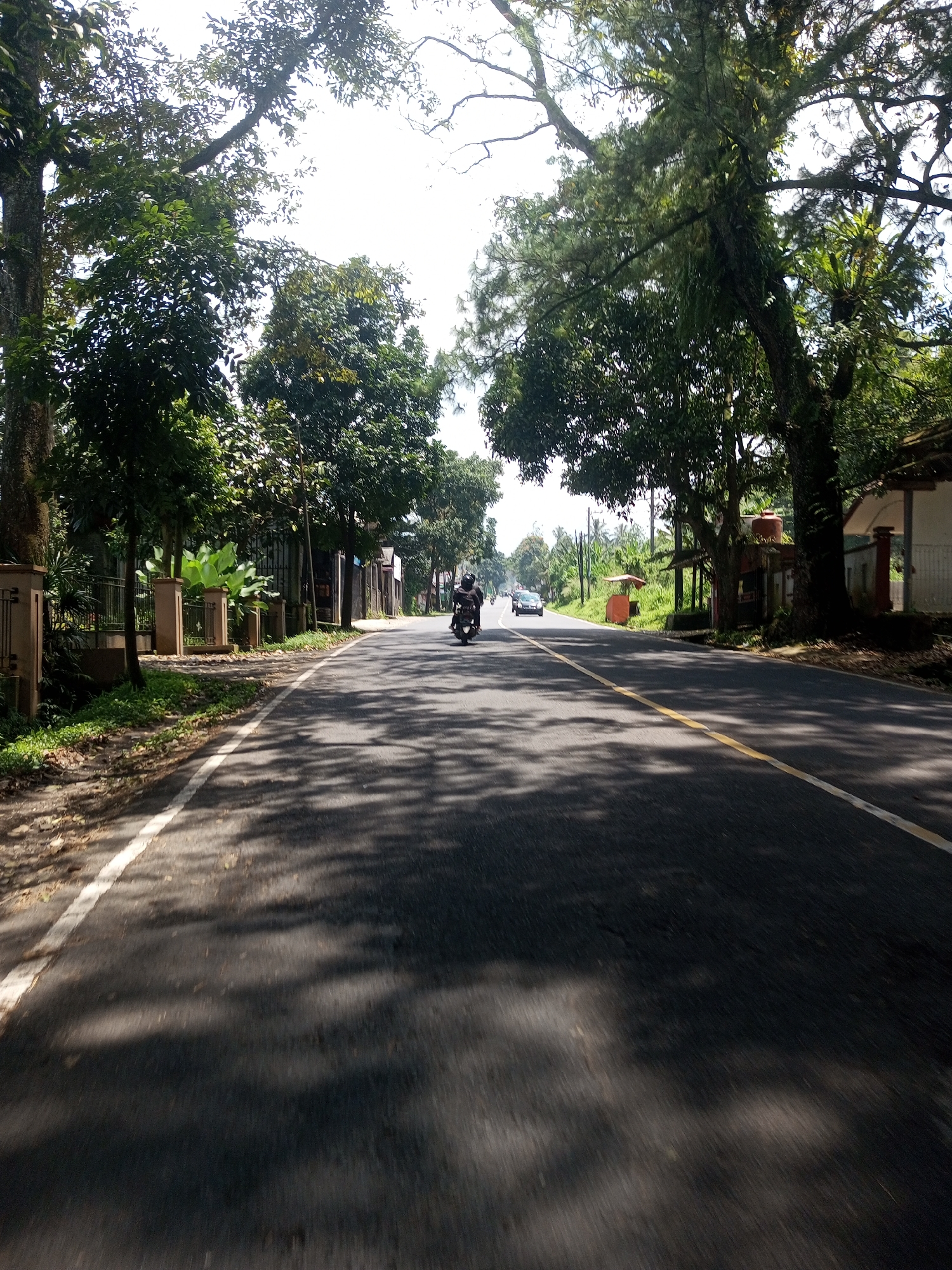 A road scene in Nawng Hkar, Myanmar. The road is paved and has a yellow line marking the center. There are trees lining both sides of the road, casting shadows. A person is riding a motorcycle down the road. A car is visible in the distance. There are houses and fences on either side of the road.