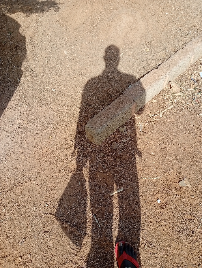 The scene depicts a sunlit outdoor environment in Barakin Sabawa, Nigeria, observed from a high-angle perspective looking down at the ground. The primary subject is the long, distinct shadow of a standing individual, cast forward onto a light brown dirt surface. The shadow's left arm extends downwards, holding an object that casts a trapezoidal shadow, possibly a bag. The shadow's right arm appears to intersect with a concrete curb or barrier. The ground consists of coarse, reddish-brown and tan dirt or sand, sparsely covered with small stones, pebbles, and dry organic debris such as twigs and plant matter. A roughly rectangular concrete curb, light grey-brown in color, runs diagonally from the mid-right towards the upper left, partially obscured by the shadow. In the bottom right corner, a bare human foot, dark-skinned, is visible, wearing a single red sandal or flip-flop. Partial shadows from overhead foliage or structures are present in the top left corner. The strong, defined shadows indicate direct sunlight.