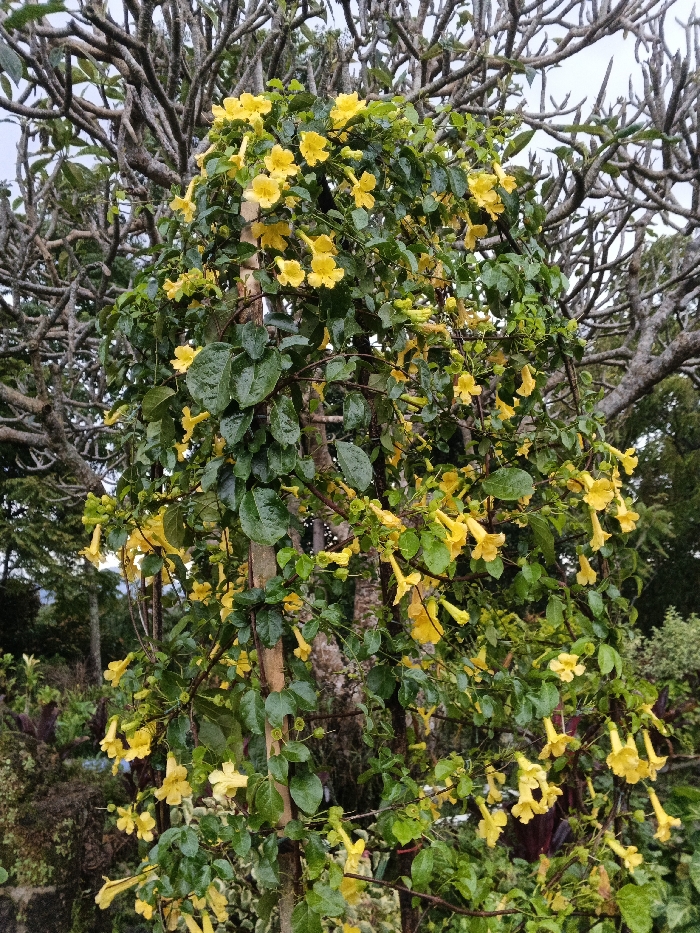 The scene depicts an outdoor natural environment in Pea Reang District, Cambodia. A dense, vibrant flowering vine, characterized by numerous yellow, trumpet-shaped blossoms and dark green, ovate leaves, is the primary subject, climbing vertically around a slender, light brown support structure. Numerous water droplets are visible on the leaves and flower petals. In the background, a large, deciduous tree with intricate, gnarled, grey-brown branches dominates the upper portion of the frame under an overcast sky. Further back, dense green foliage and other trees are visible, with some dark reddish-purple plants present in the lower left foreground. No human figures, animals, or specific man-made objects other than the vine's support are present.