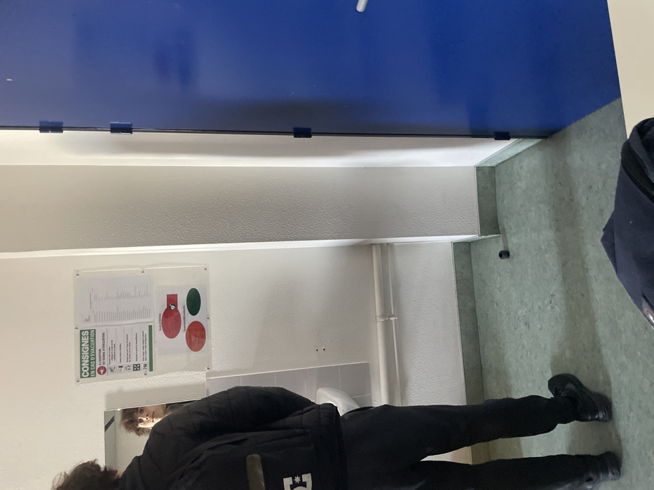 The scene depicts an interior space, specifically a washroom or similar facility, located in Schiltigheim, France. The environment features textured white walls, a light green tiled floor with darker green baseboards, and a white vertical structural column. A white ceramic sink is partially visible on the far left. Above the sink, a rectangular mirror reflects the face of an individual with dark, curly hair. To the right of the sink, a clear acrylic display case on the wall contains two documents: the upper document displays "CONSIGNES EN CAS D'ÉVACUATION" (Evacuation Instructions) with text and pictograms, while the lower document features prominent red and green oval graphics with accompanying text. A bright blue door with dark hinges is positioned on the right side of the frame. On the floor, a small black cylindrical object lies near the baseboard between the column and the door. In the lower right foreground, a dark blue bag is partially visible. An individual, seen from behind, stands facing the sink. This person wears a black puffer jacket, dark trousers, and black athletic shoes. A black backpack with a white "DC" logo is worn over the jacket. The individual is observed looking into the mirror at their own reflection.