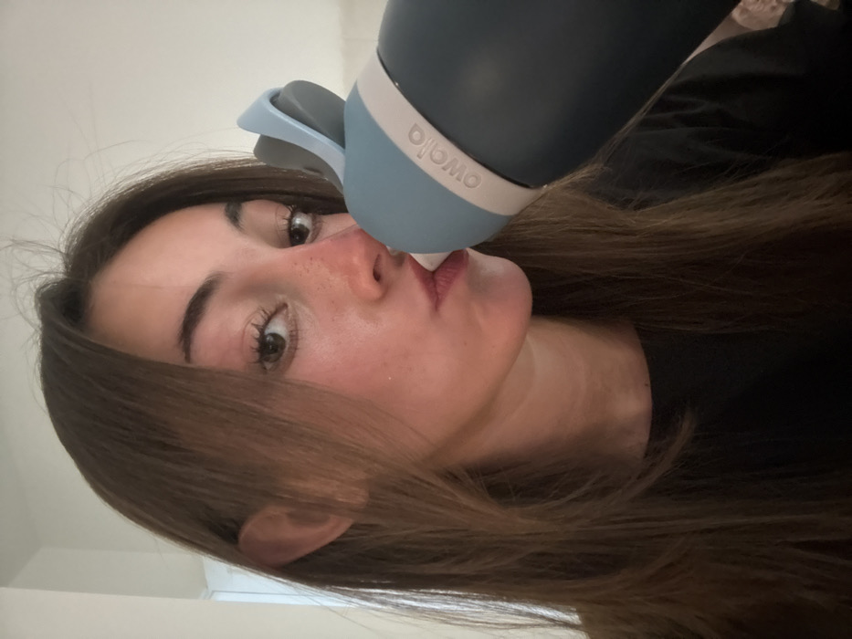 A young adult female is depicted in a close-up, head-and-shoulders image, actively drinking from a dark blue Owala brand water bottle
