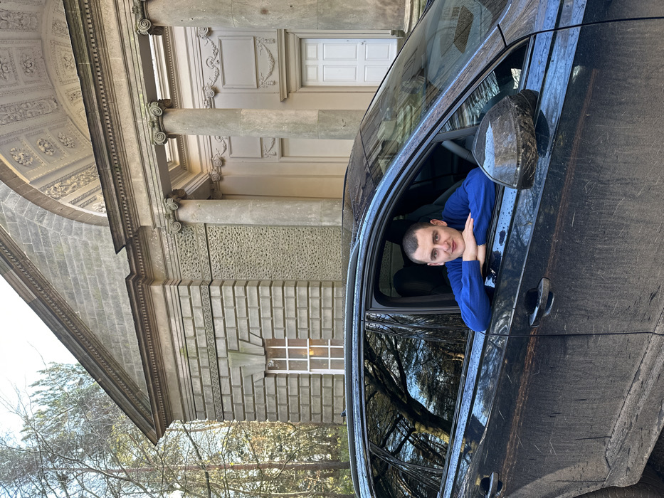 A dark-colored SUV, visibly soiled with mud on its lower body panels, is positioned outdoors in front of a substantial stone building. A male individual is partially visible through the fully lowered driver's side window, leaning forward with his forearms resting on the window frame and hands interlocked. He has short dark hair, a light complexion, and is wearing a royal blue long-sleeved top. He maintains a direct gaze towards the camera with a neutral expression. The background features a prominent classical-style stone building, identified as a section of Shugborough Hall, located near Stafford, United Kingdom. The building exhibits a triangular pediment atop an entablature, supported by at least two visible Corinthian columns forming a portico. Intricate friezes and ornate ceiling details are discernible within the portico. To the left of the columns, the building displays block-like ashlar stonework with a distinctive decorative chain-link pattern frieze and a textured stone panel. A rectangular window with a white sash frame is present on this section. A white double door is visible within the portico. Bare-branched trees are visible in the far left background under a bright sky.