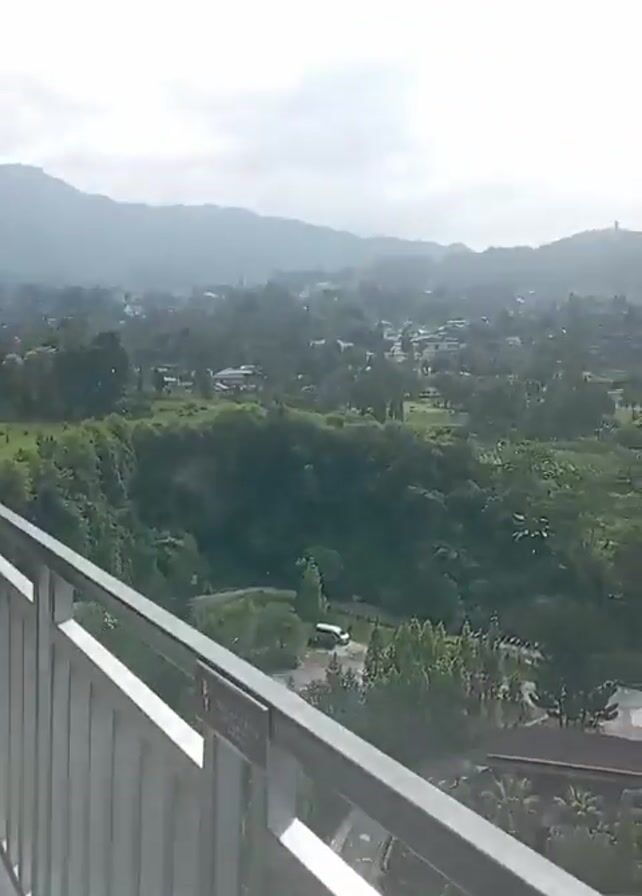 balcony with a metal railing, a wicker table, and a view of a mountainous landscape. The sky is cloudy with the sun shining through. The camera pans up from the balcony furniture to the landscape and sky. The sun is visible through the clouds, creating a bright glare. The video ends with a view of the sun shining through the clouds.