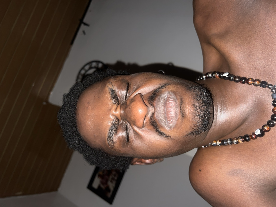 A close-up indoor image depicts an adult male of dark complexion, featuring short, dark, curly hair, a mustache, and a goatee. His eyes are tightly closed, the forehead is deeply furrowed, the nose is wrinkled upwards, and the lips are puckered, conveying an intense expression of discomfort or strong sensation. He appears shirtless, exposing his upper torso, and wears a multi-strand beaded necklace composed of dark, brown, and metallic beads, with a prominent black spherical bead resembling an 8-ball near the center. A small silver hoop earring is visible in his left ear. The background reveals a light-colored wall, a section of a brown wooden-paneled ceiling, a dark framed picture mounted on the wall to the left, and a partially visible dark, circular object to the right. The exact location within the city of Adankolo, Nigeria, cannot be determined from the visual information provided.