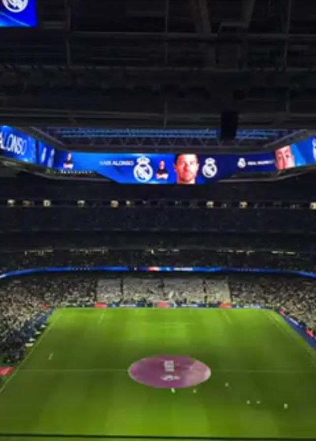 view of a packed soccer stadium, likely the Santiago Bernabéu Stadium, from a high vantage point. The stadium is brightly lit and full of spectators wearing white clothing. A large circular pink logo is visible in the center of the field. Overhead, a scoreboard displays images of former Real Madrid players, including Xabi Alonso and Raúl González. The numbers "26" are also displayed prominently. The atmosphere appears lively, with the sound of an announcer audible.