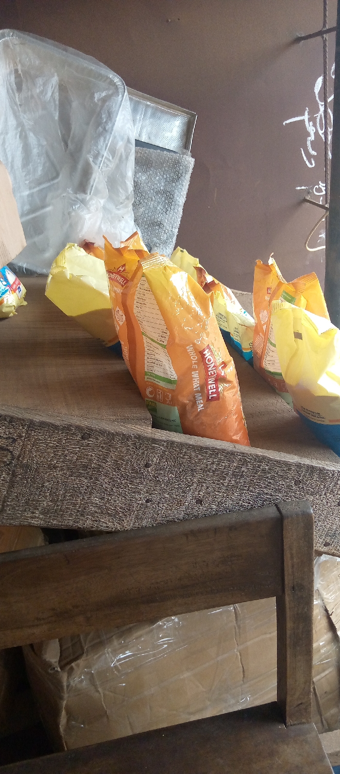 The image depicts an indoor scene in Nsugbe, Nigeria, appearing to be a storage or retail area. The foreground features a dark brown wooden structure, likely a lower shelf or chair back. Beneath this, partially visible, are several brown cardboard boxes, some wrapped in clear plastic. The midground displays a lighter brown, textured wooden plank or shelf. On this surface, at least five bags of food products are arranged. Three prominent bags are orange and yellow, clearly labeled "HONEYWELL WHOLE WHEAT MEAL," standing upright or slightly leaning. Other bags, primarily yellow and one with a visible blue section, are also present. In the background, resting on the same wooden surface, are a crinkled clear plastic bag, silver-toned textured material (resembling bubble wrap), and a metallic frame. The rear wall is a plain brown, marked with white, chalk-like script or symbols. A dark vertical beam or pole is visible on the far right side of the frame. No individuals or active interactions are present.