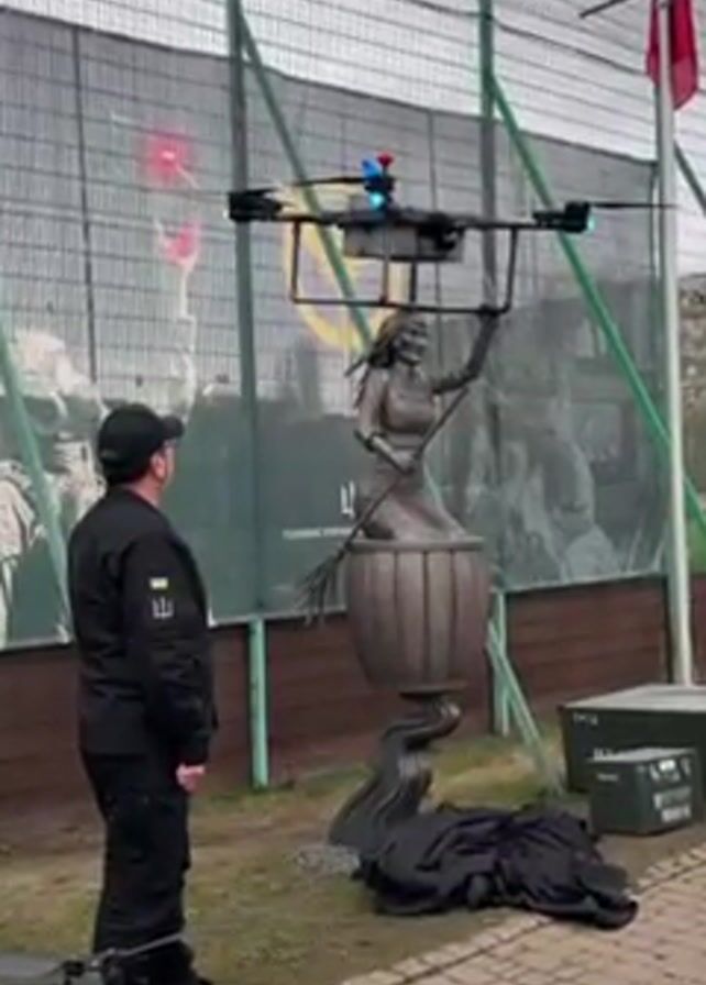 man wearing a black uniform with a Ukrainian flag patch, standing and looking at a statue of a woman dressed in old-fashioned garb, sitting on a barrel and holding a broom. A drone with flashing red and blue lights is hovering above the statue. The statue is standing in front of a backdrop with other figures on it. A black cloth and a piece of equipment are on the ground nearby. The ground is paved with bricks, and a green fence is visible in the background. A red flag hangs in the distance to the right of the frame.