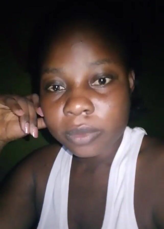 dark-skinned woman wearing a white tank top. She looks at the camera, sometimes glancing down. Her hand is raised near her face, with her fingers extended, seemingly touching her cheek. The background is dark, with indistinct green hues visible. The lighting is poor.