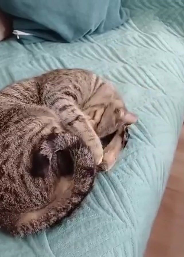 On a blue couch, a brown tabby cat is curled in a ball, facing the camera. The cat has its paws on its face, grooming. A blue pillow is behind the cat, and a light brown rug is on the floor to the right of the couch. The cat is the primary focus of the video.