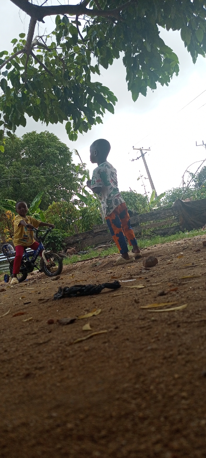 The image captures an outdoor scene at a low vantage point on reddish-brown dirt ground. Two young male children are present. On the left, a child approximately 3-5 years old, wearing a yellow shirt and red pants, is seated on a small blue bicycle with white training wheels. On the right, a second child, approximately 4-6 years old, wearing a patterned light shirt and orange and blue patterned long pants with off-white sandals, stands facing right, holding a thin plant stem vertically. The immediate foreground shows scattered pebbles, dried leaves, and a dark, twisted object on the dirt. The midground and background consist of dense green foliage, including large-leafed plants resembling banana trees. An overhead tree branch with numerous green leaves partially shades the upper portion of the frame. In the right background, a stack of weathered wooden planks is visible, along with two utility poles against an overcast sky. A section of barbed wire fencing is also discernible in the far right background. On the far left, a corrugated metal fence or wall is partially visible behind the child on the bicycle. The scene appears to be an unpaved, vegetated area, possibly a residential yard or undeveloped plot in an unspecified rural or semi-urban setting.