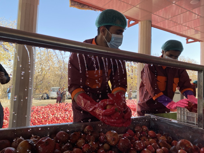 Two workers wearing maroon uniforms, green hairnets, and masks wash fruit, likely apples or pomegranates, at a processing facility. Water cascades from a pipe above. The workers use red and purple gloves to handle the fruit, placing some into a crate. Outside, a large pile of bagged fruit is visible with people standing nearby and vehicles parked. Trees with autumn foliage line the background under a clear sky.