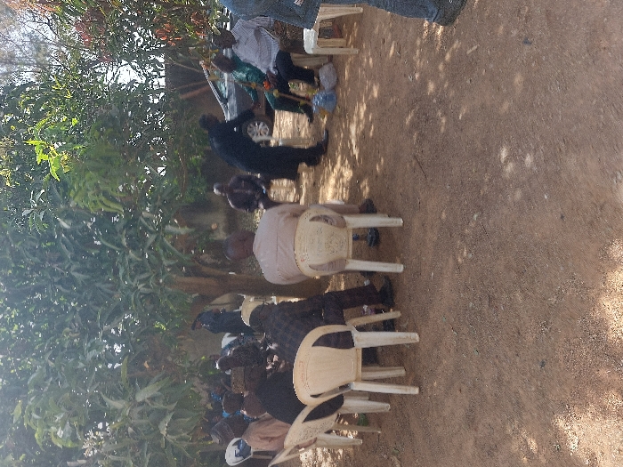 The image captures an outdoor gathering of approximately 10-12 adult males in Pankshin, Nigeria, under a canopy of trees during daylight. The ground is unpaved, consisting of reddish-brown dirt with scattered small debris and visible shadows. Several men are seated on light-colored plastic chairs arranged in an informal semi-circle or cluster. Most individuals are dressed in a mix of traditional Nigerian attire, including long shirts and caps, and casual wear such as collared shirts and trousers. In the center-right, a man in a dark, full-length garment stands, leaning towards a seated man wearing a light-colored collared shirt, dark trousers, and a distinct green garment or sash draped over his shoulder. Several plastic water bottles are visible on the ground near their interaction. Other men are seated with their backs or sides partially visible to the viewer, appearing to observe or participate in the discussion. A dark-colored sedan car is partially visible parked in the background to the right, behind some trees and a light-colored wall or building. Dense green foliage from the overhead trees provides shade for the gathering.