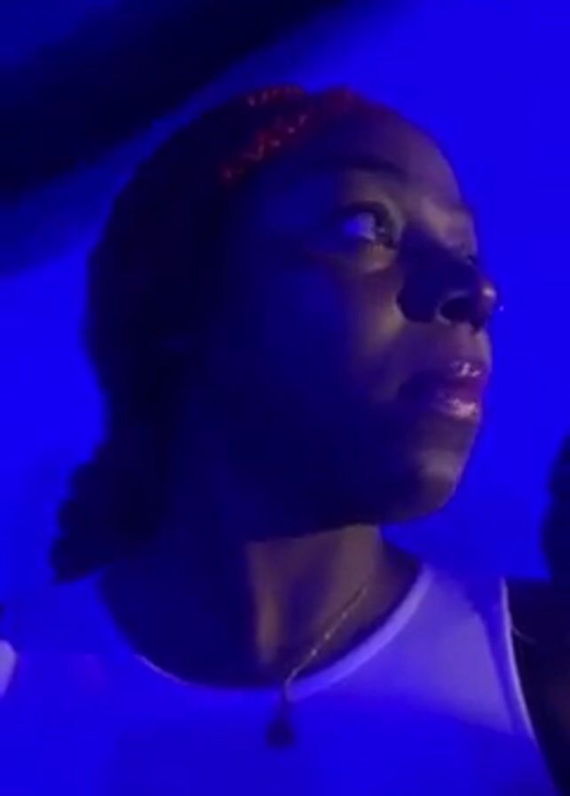 A person stands in front of a blue backdrop. The person is Black and wears a white tank top. The person has braided hair, a gold necklace, and a ring. The person brings their right index finger up to their right cheek.