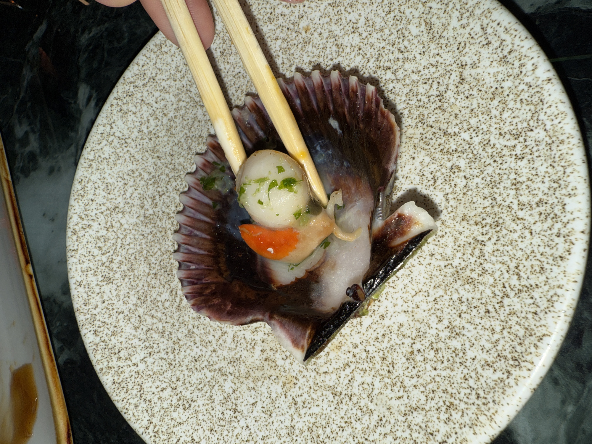 The image displays a close-up, overhead view of a single scallop served in its natural shell, positioned on a speckled white ceramic plate. A hand, visible on the right side of the frame, is holding a pair of light wooden chopsticks. The chopsticks are actively engaged, gripping the white, rounded scallop adductor muscle, which is garnished with finely chopped green herbs. Adjacent to the scallop muscle, the orange coral (roe) is visible. The scallop shell itself exhibits dark purple-brown and white coloration on its interior, with dark frilled edges. A small amount of liquid or sauce is present within the shell. The plate rests on a dark, possibly marble or stone, tabletop with subtle veining. A portion of another dish or a serving tray, showing an amber liquid, is partially visible in the upper left corner. The scene depicts a culinary presentation, likely within a restaurant or dining setting in Barcelona, Spain.