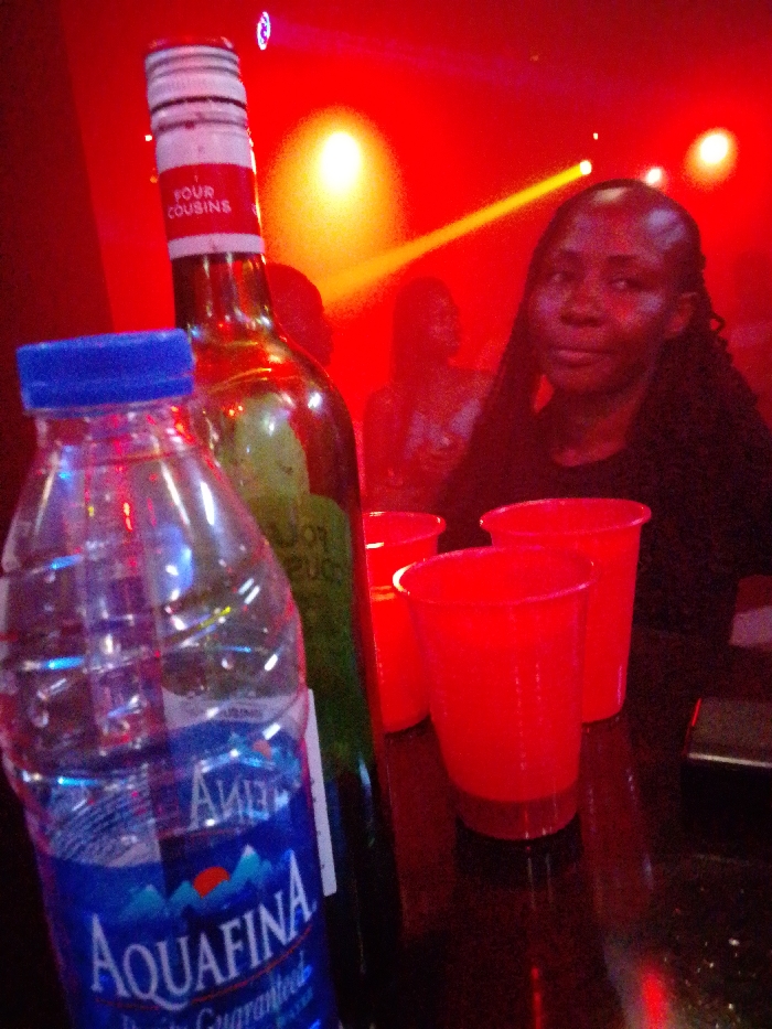 At a dimly lit party, a water bottle, a wine bottle labeled "FOUR COUSINS", and three red plastic cups sit on a reflective surface. A woman looks towards the camera, a second woman is in the background. Red lighting illuminates the scene, with bright spots in the distance.