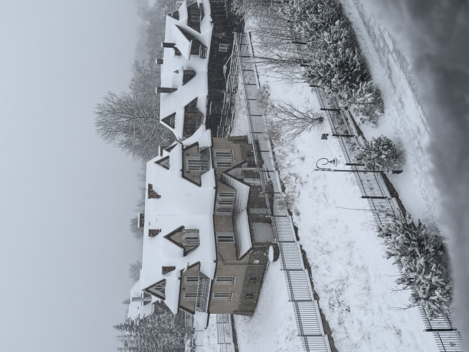 A grayscale aerial shot reveals a line of snow-covered buildings with sharply pitched roofs, flanked by trees and a wrought-iron fence