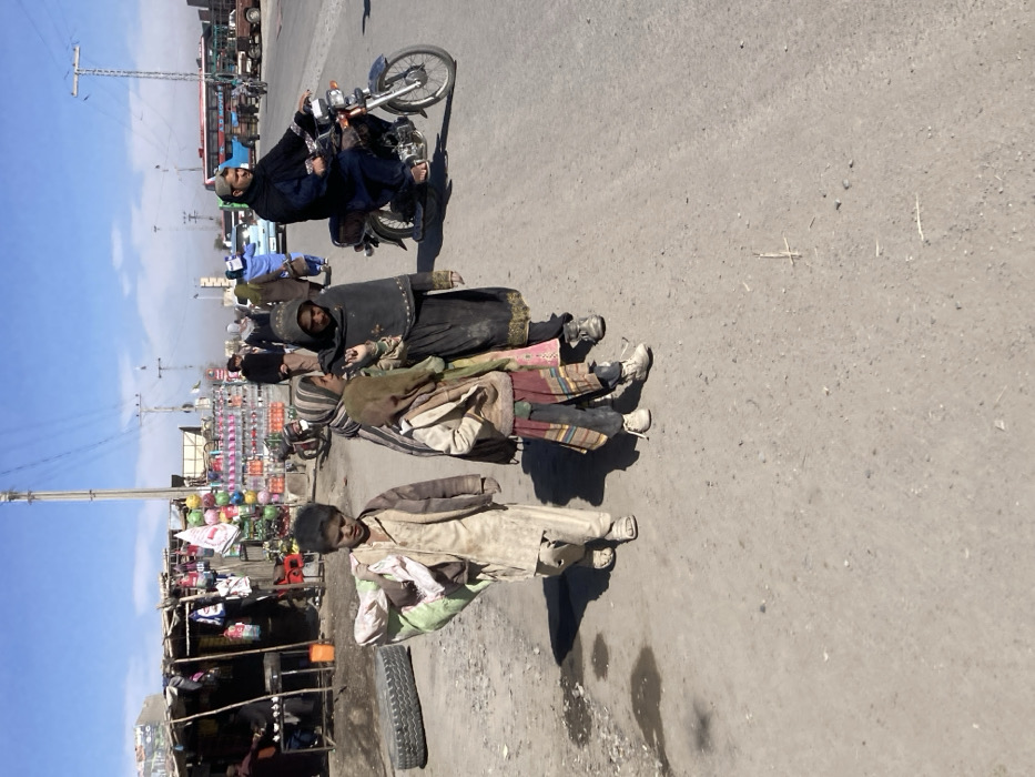 Three individuals and a man on a motorcycle are on a gray road. The first individual is dressed in dark clothing, followed by another in patterned clothes, and a third in light-colored clothes. A roadside stall of goods and a tire are visible. Overhead electrical wires run between utility poles. Vehicles including a bus and blue car are in the background against a clear blue sky.