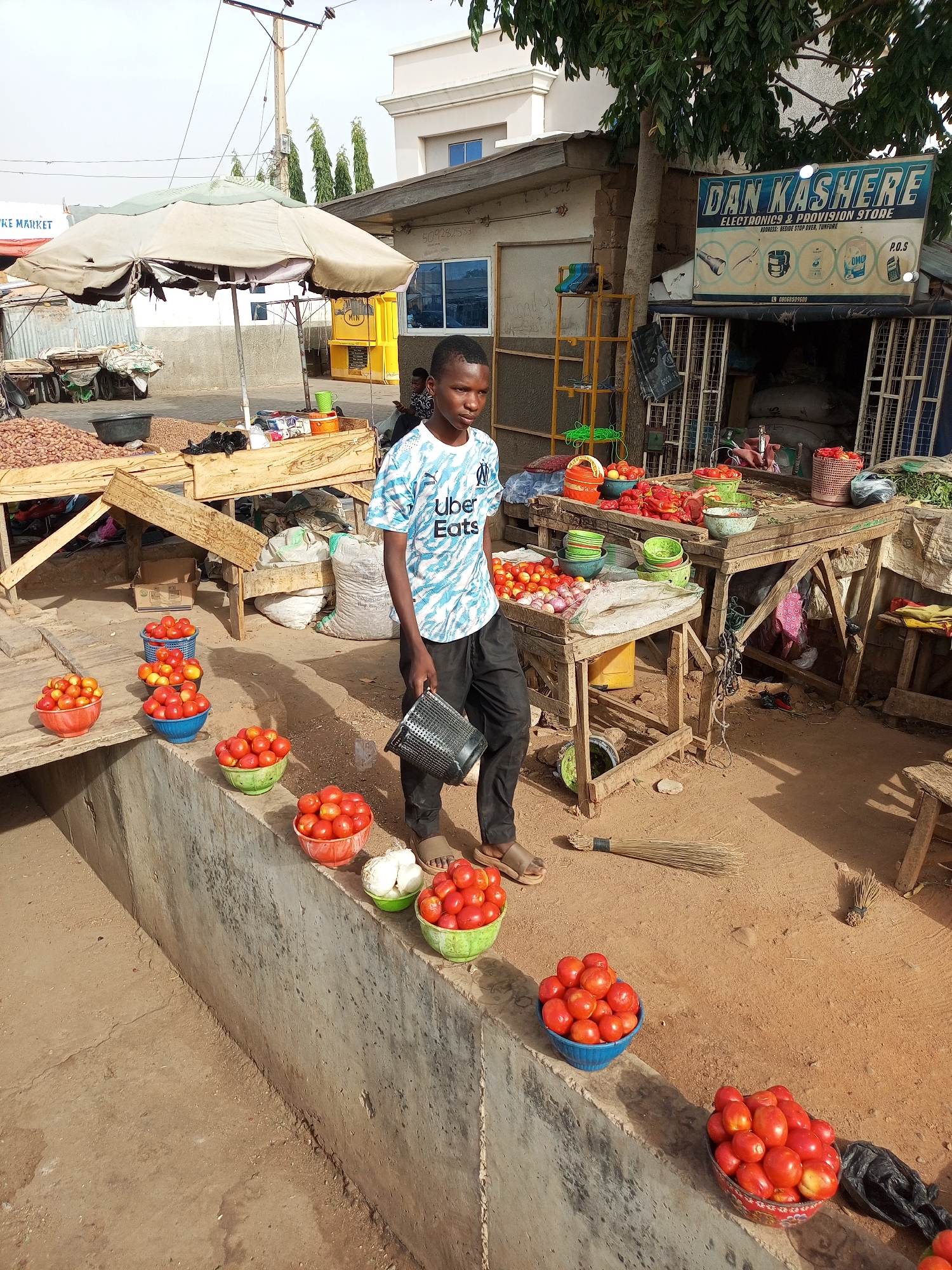 The image captures an outdoor market scene in Tempure, Nigeria, under natural daylight conditions