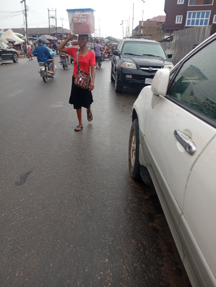 The image displays a street scene in Ura Nta Umuarandu, Nigeria, under an overcast sky, with the asphalt road appearing wet or damp. In the center-left foreground, a young adult female, dark-skinned, walks from right to left. She wears a red short-sleeved top, a black skirt, and sandals, and carries a multi-colored patterned shoulder bag. On her head, she balances a clear, rectangular plastic container with a red lid, prominently labeled "Destiny Snacks" in white text. Her left hand is raised, touching the container, seemingly to steady it. To her immediate right, the front wheel and lower side panel of a white vehicle are visible. Further into the mid-ground, a black SUV, identified as an Acura MDX by its grille and headlight design, faces the viewer, positioned to the right of the walking woman. Its license plate is partially visible, displaying blue text and white numbers. Behind this SUV, buildings with brown facades and white-framed windows are visible, partially obscured by what appears to be a corrugated metal fence. In the mid-background to the left of the walking woman, a person on a motorcycle, wearing a blue long-sleeved top, moves in the same direction as the woman. Other individuals and motorcycles are scattered further down the street. On the far left, market stalls with dark coverings are discernible. Overhead, utility poles and numerous power lines crisscross the sky. A dark, irregular smudge or patch is visible on the wet asphalt surface in the lower-left portion of the image.
