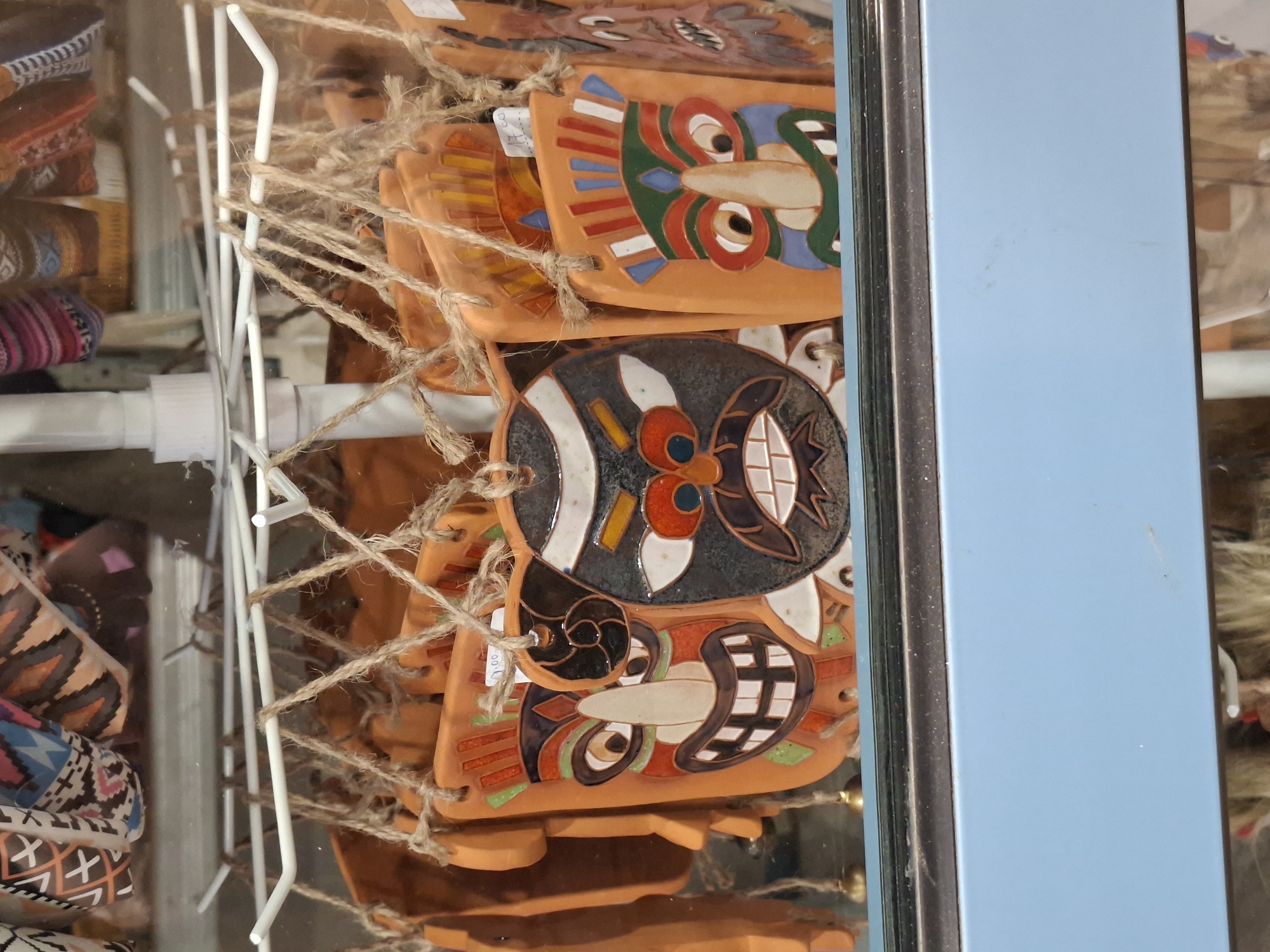 display of terracotta souvenir masks with painted designs hanging on a white wire rack, viewed through a glass surface, possibly a window or display case