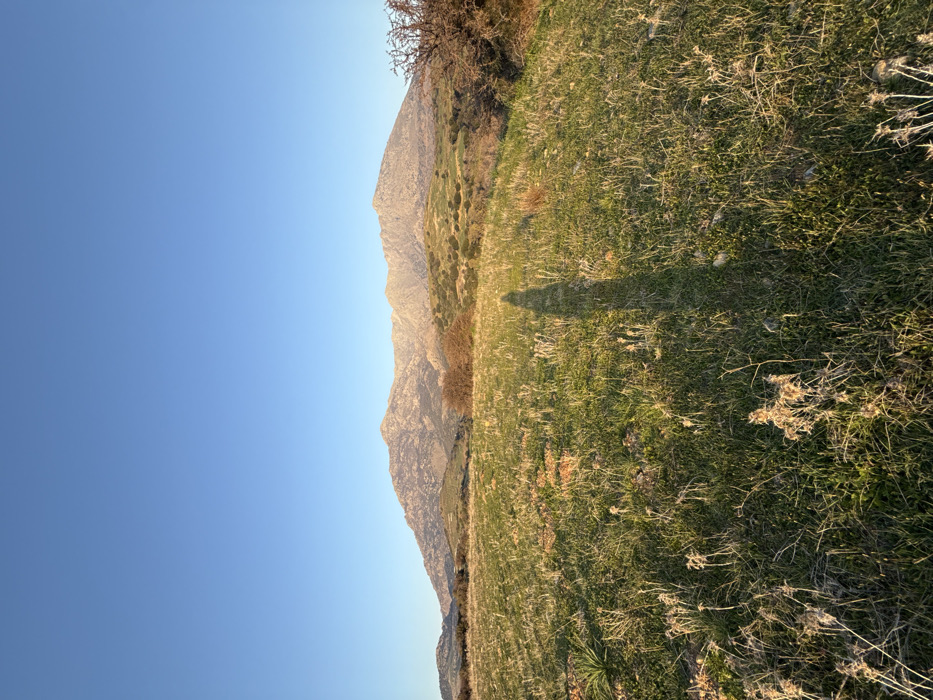 This image depicts a natural landscape in a mountainous region, stated to be near Alonia, Greece, under a clear blue sky. The foreground features an uneven field of mixed green and dry grasses and sparse low-lying plants. A distinct, elongated shadow of a single human figure projects across the foreground from the lower center of the frame, extending towards the midground. The midground consists of rolling hills sparsely covered with scrub brush and some deciduous trees. In the background, a range of rugged, rocky mountains is visible, illuminated by a low-angle sun from the right, highlighting their peaks and slopes. The sky is uniformly clear and bright blue, occupying the upper portion of the frame. No other human figures, structures, or artificial objects are present.