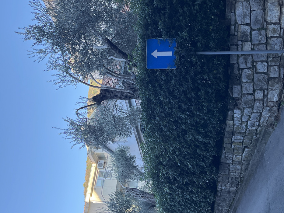 The image depicts an outdoor scene in Petrovac na Moru, Montenegro, under a clear blue sky. In the foreground, a paved pathway runs parallel to a dry-stacked stone wall, composed of varied grey and brown blocks. A dense green hedge, approximately 1.5 to 2 meters tall, rises behind the stone wall. A blue square road sign, featuring a white upward-pointing arrow, is mounted on a grey metallic pole positioned in front of the hedge. Behind the hedge, several gnarled olive trees with dark, twisted trunks and silvery-green foliage are visible. Further in the background, a light-toned, multi-story building, likely an apartment or hotel, features a balcony with a white railing and an external air conditioning unit on its upper level. Portions of a reddish-brown tiled roof are also visible. A sparsely vegetated hillside ascends behind the building. No individuals are present. The scene is illuminated by natural daylight.